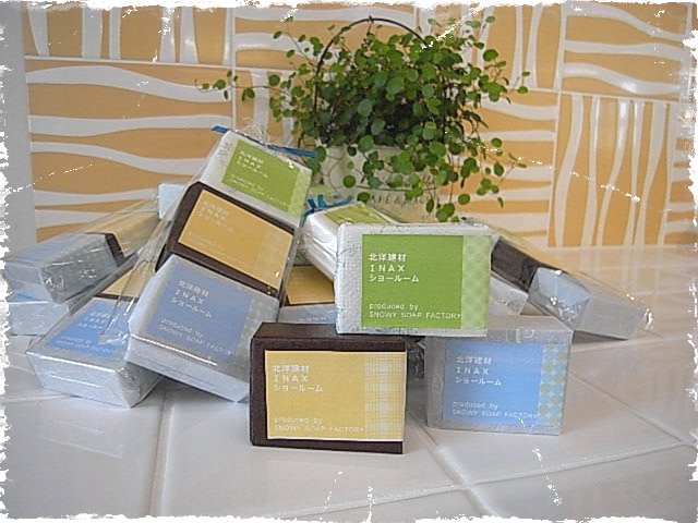 「手作り石けん工房 SNOWY SOAP FACTORY」さん(最近はTVの取材を受けたとか...大変お忙しそうです)に初夏をイメージとしたオリジナル石けんの作成をお任せでお願いし、写真のような石けんが完成致しました。
